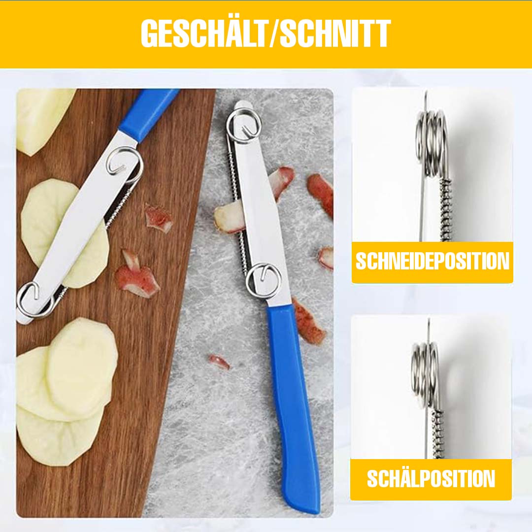 Unser Obst- und Gemüseschäler ist perfekt für eine Vielzahl von Obst und Gemüse, einschließlich Kartoffeln, Gurken, Karotten u.v.m. Halten Sie das Messer in Ihrer Arbeitshand und führen Sie die Klinge in den Abstandsring ein, so dass die Feder immer nach oben zeigt und sich über der Klinge befindet, wenn Sie das Messer zu sich ziehen.
